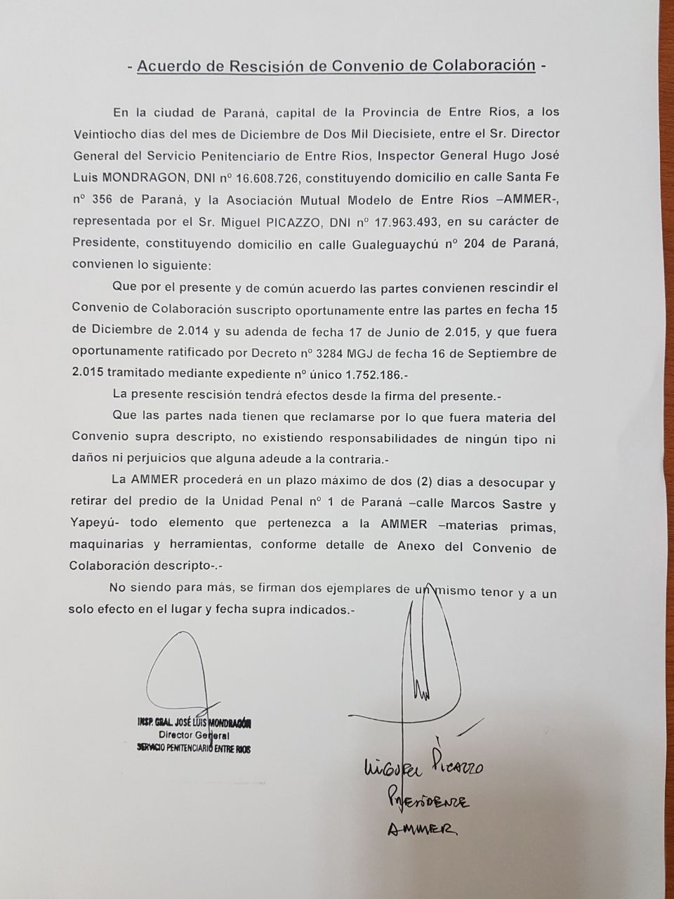 CompartirOficial Luego de las denuncias e investigaciones en marcha, el gobernador Bordet y la ministra Romero le ponen fin al irregular acuerdo que suscribió la entidad que incluía mano de obra en negro, evasión y deslealtad comercial. La semana pasada trascendía que luego de un encuentro que se habían mantenido … Sigue leyendo El Gobierno rescindió el polémico convenio de los colchones entre la Mutual Modelo y el Servicio Penitenciario.