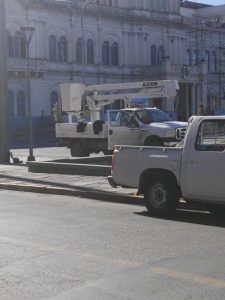 La semana pasada, una vez más, no hubo pabellones en los mástiles y este lunes se pudo ver a una camioneta de Enersa haciendo reparaciones.