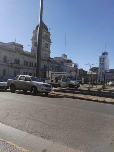 La semana pasada, una vez más, no hubo pabellones en los mástiles y este lunes se pudo ver a una camioneta de Enersa haciendo reparaciones.