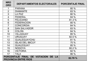 Los datos que salieron a oficializar, indicando que provenían de Gendarmería, indican en Concordia un 85% de concurrencia.