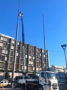 Sin ir más lejos, en la mañana de este lunes, un camión de ENERSA y varios operarios se presentaron en la plaza para reparar por enésima vez los mástiles, algo que ya es habitual para quienes trabajan, pasan o esperan el colectivo en la plaza.