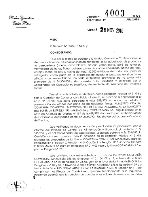 Este Portal, luego de las denuncias y quejas de los que menos tienen, investigó, llegando a la licitación pública N°38/18, la cual fue adjudicada mediante el decreto N°4003/18 que lleva la firma del gobernador Gustavo Bordet y la ministra Stratta.