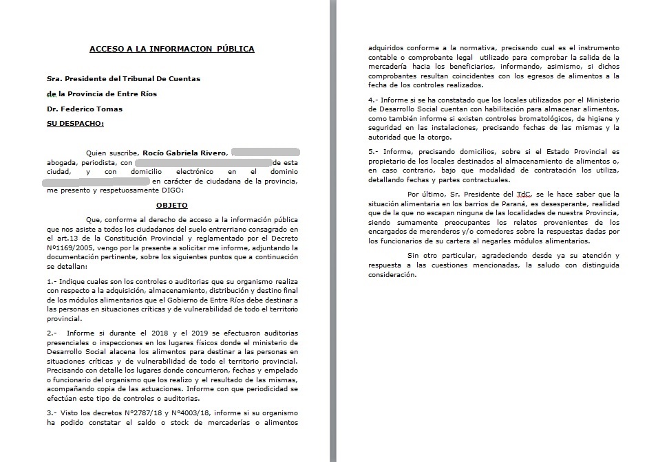 Frente a aquellas serias sospechas, que fueron aumentando tras los distintos episodios gravísimos que envolvieron a las organizaciones sociales, caso del galpón precario sin ningún tipo de habilitación para almacenar alimentos, desconociéndose en carácter de qué aquellas los mantenían guardados, la primera semana de julio ingresó un pedido de acceso a la información publica en el despacho de Stratta.