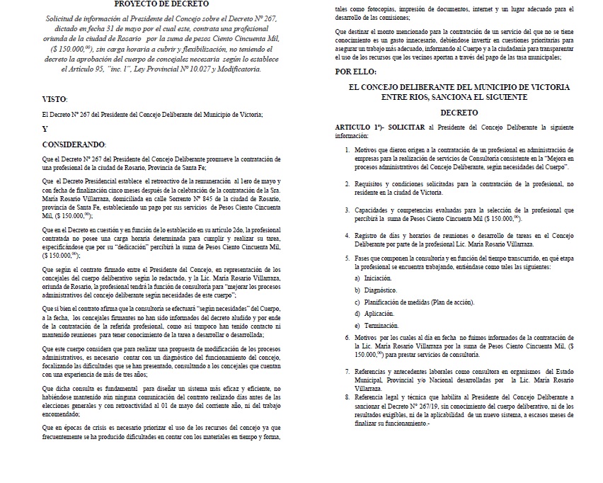 También que explicite “los requisitos y condiciones solicitadas para la contratación de la profesional, no residente en la ciudad de Victoria”. Y las “capacidades y competencias evaluadas para la selección de la profesional que percibirá la suma de $ 150.000”.