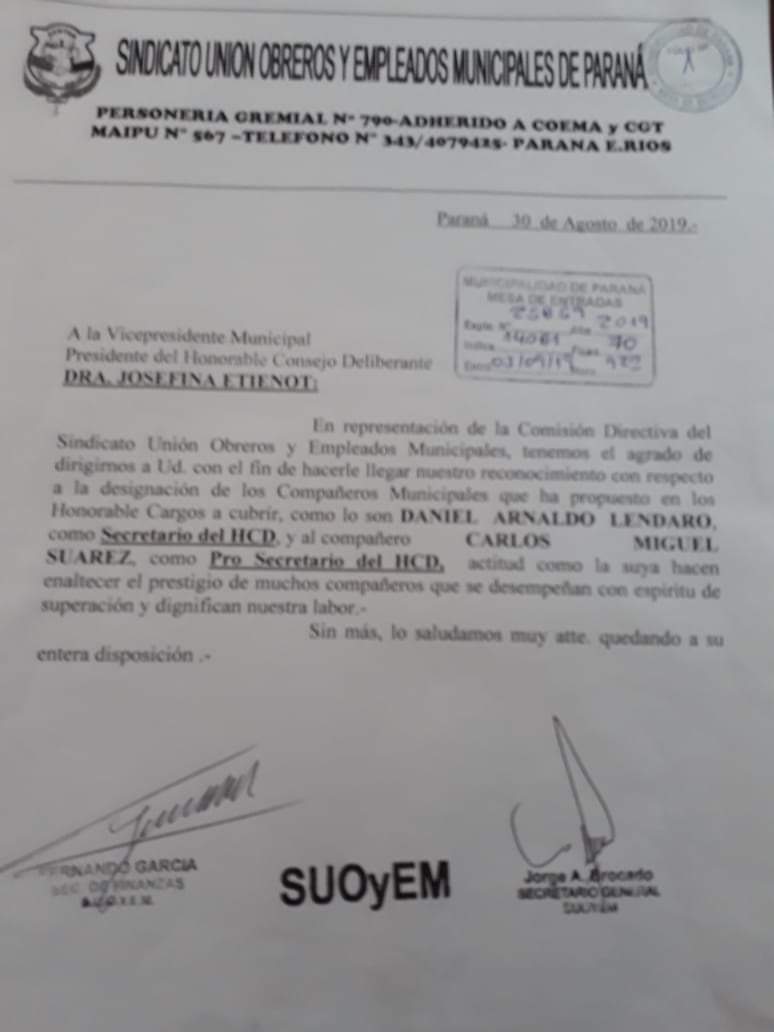 En la misma, el SUOYEM manifiesta a Etienot su “reconociendo con respecto a la designación de los Compañeros Municipales que ha propuesto en los Honorable Cargos a cubrir, como lo son DANIEL ARNALDO LENDARO, como secretario, como Pro-Secretario del HCD, actitud como la suya hacen enaltecer el prestigio de muchos compañeros que se desempeñan con espíritu de superación y dignifican nuestra labor”.