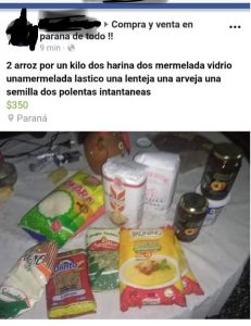 Eso se desprende de las publicaciones que se han visto en grupos de compraventa en las redes sociales en los que se ofrecen por unos pesos los productos que componen lo que se denomina un módulo alimentario.