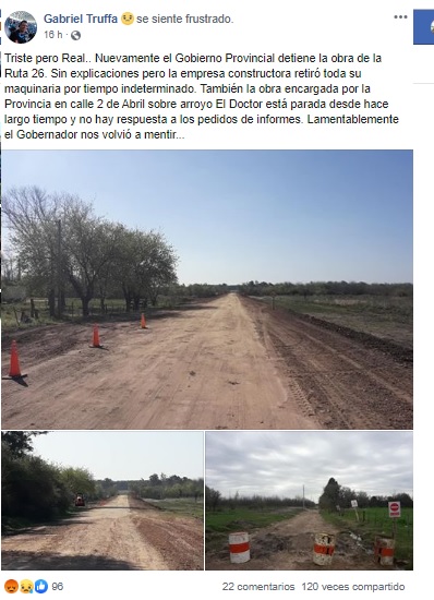«Triste pero Real…» comienza manifestando Truffa para luego describir: «Nuevamente el Gobierno Provincial detiene la obra de la Ruta 26».