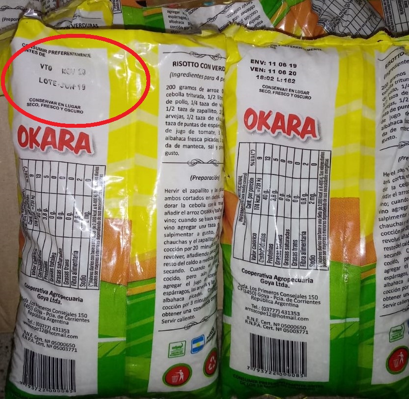 Otra irregularidad es que algunos de los alimentos, según puede apreciarse en las imágenes enviadas por los vecinos, presentan tanto la fecha de vencimiento como el número de lote borradas.