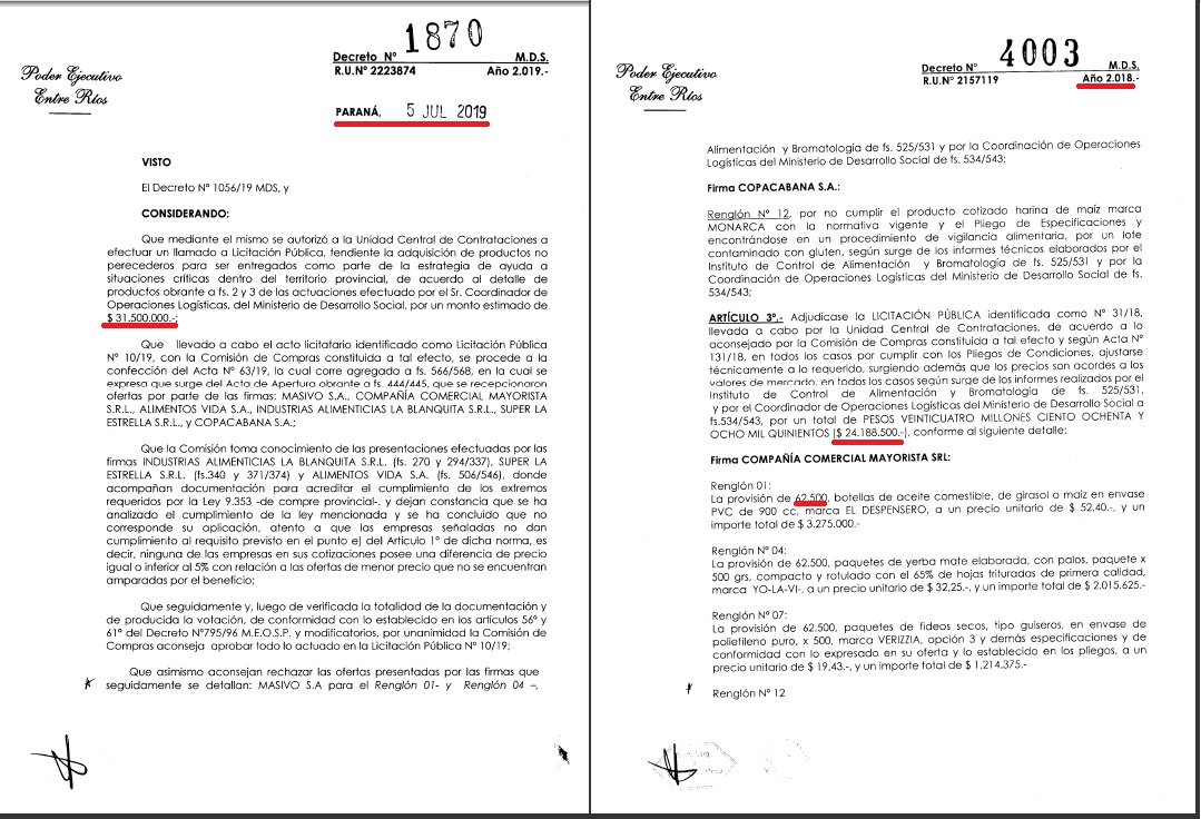 En diciembre del 2018, mediante decreto que lleva la firma de Bordet y Stratta, se aprobaban las actuaciones de la Unidad Central de Contrataciones en la Licitación pública N°31/18 por la cual se adquirieron 62.500 módulos alimentarios, para los que se destinaron más de 24 millones de pesos.
