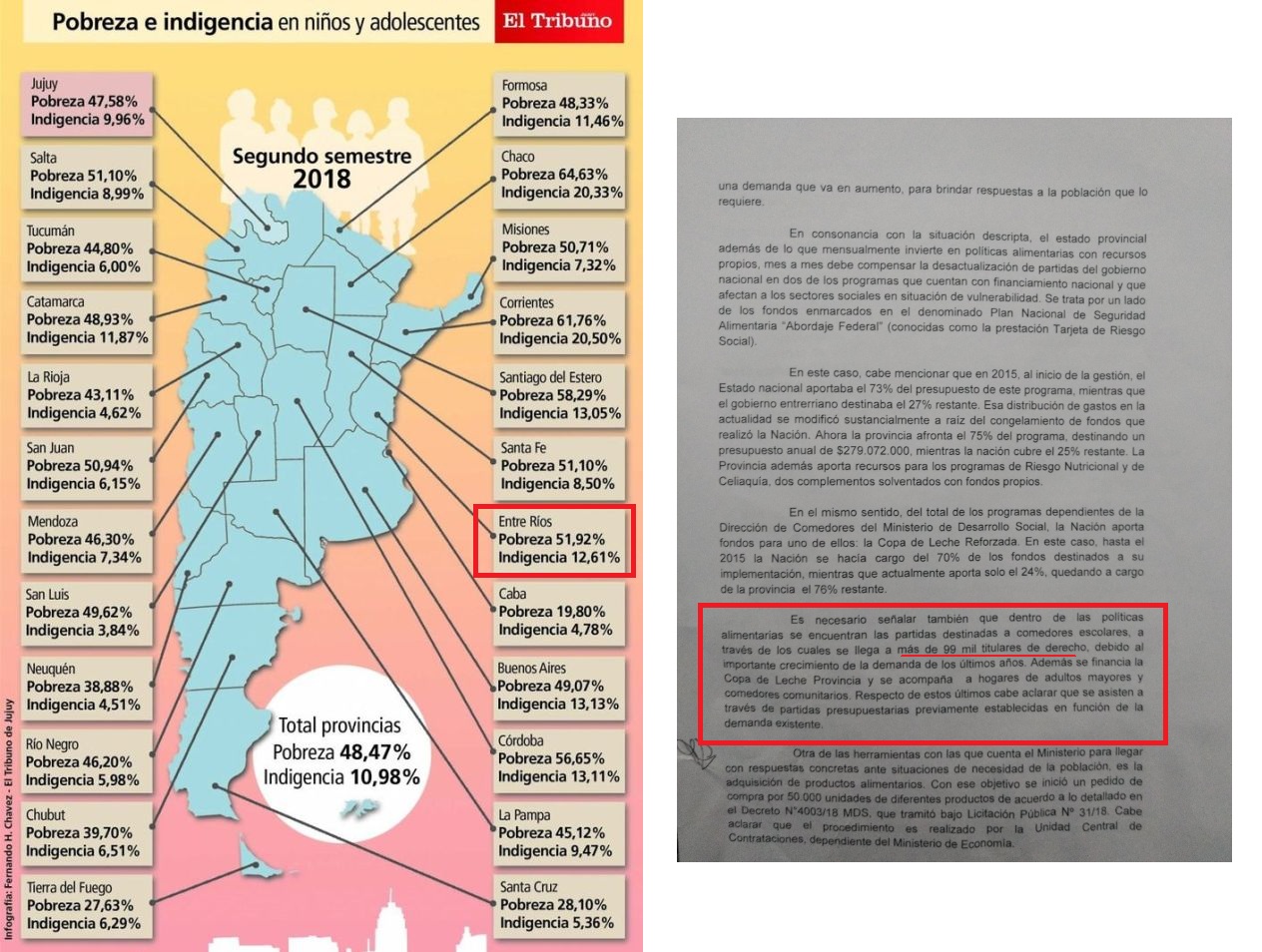 Según los datos recabados la organización independiente y sin fines de lucro, 206.382 niños entrerrianos se ubicaron por debajo de la línea de pobreza (el 51,92% de la población total) y, 50.115 los que permanecieron en la indigencia (el 12,61%).