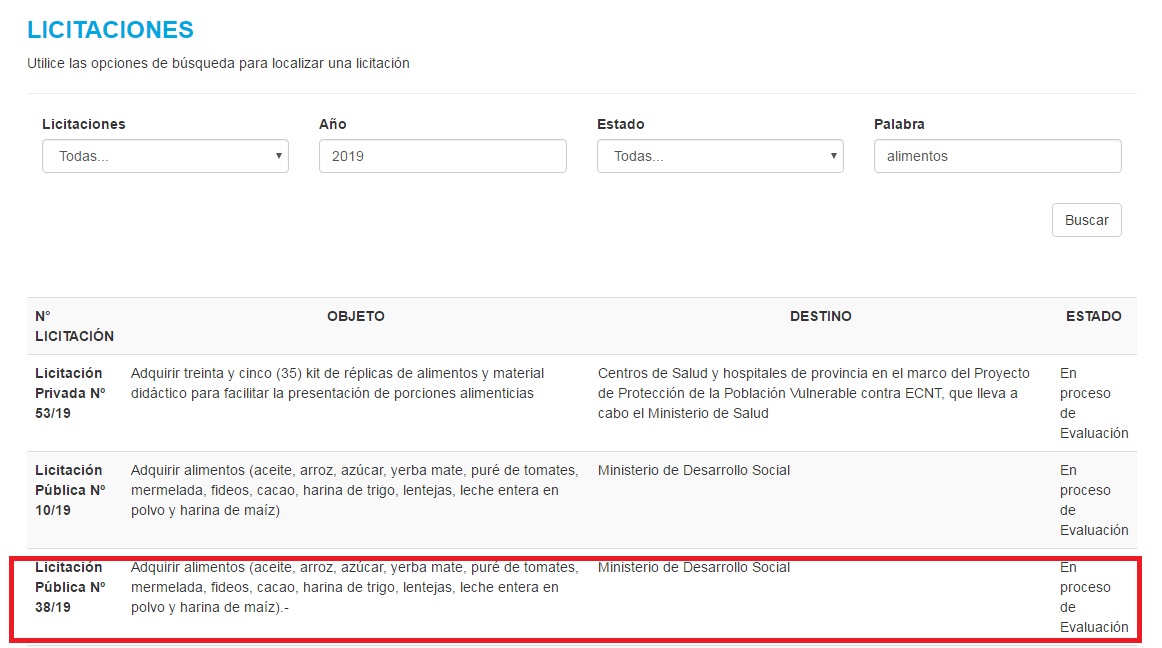 Actualmente existe un nuevo proceso de licitación pública en marcha, la Nº 38/19, para adquirir alimentos (aceite, arroz, azúcar, yerba mate, puré de tomates, mermelada, fideos, cacao, harina de trigo, lentejas, leche entera en polvo y harina de maíz), aunque, en virtud de la ausencia total de transparencia de los actos de gobierno aun no es de acceso ciudadano, se desconocen el monto fondos públicos que se destinaran como la cantidad de módulos a comprar.
