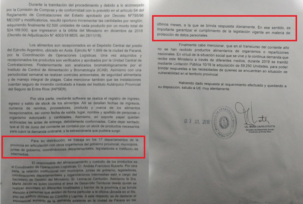 La respuesta de la ministra llegó el 22 de julio, y dejó mucho que desear. Luego de dos páginas de discurso de campaña política, de manera totalmente evasiva, Stratta no quiso identificar a las personas (físicas o jurídicas) beneficiarias de los 62.500 módulos alimentarios.