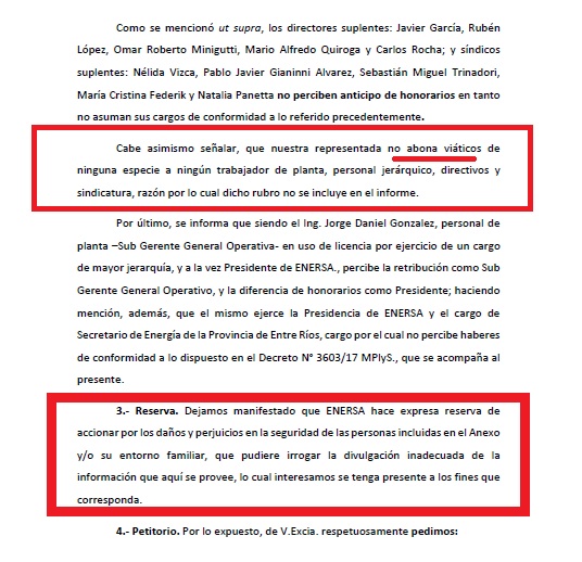 «3.- Reserva. Dejamos manifestado que ENERSA hace expresa reserva de accionar por los daños y perjuicios en la seguridad de las personas incluidas en el Anexo y/o su entorno familiar, que pudiere irrogar la divulgación inadecuada de la información que aquí se provee, lo cual interesamos se tenga presente a los fines que corresponda», advirtieron en el escrito.
