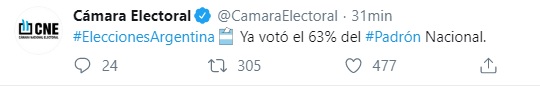 CompartirLos datos de la Cámara Nacional Electoral a las 16.15 horas. Según los datos aportados por la Cámara nacional electoral a las 16.15 horas, votó el 63% del padrón nacional. Compartir