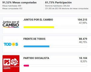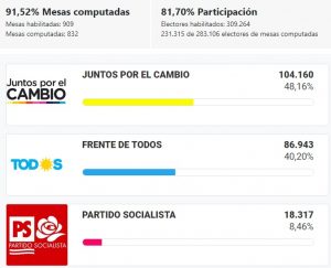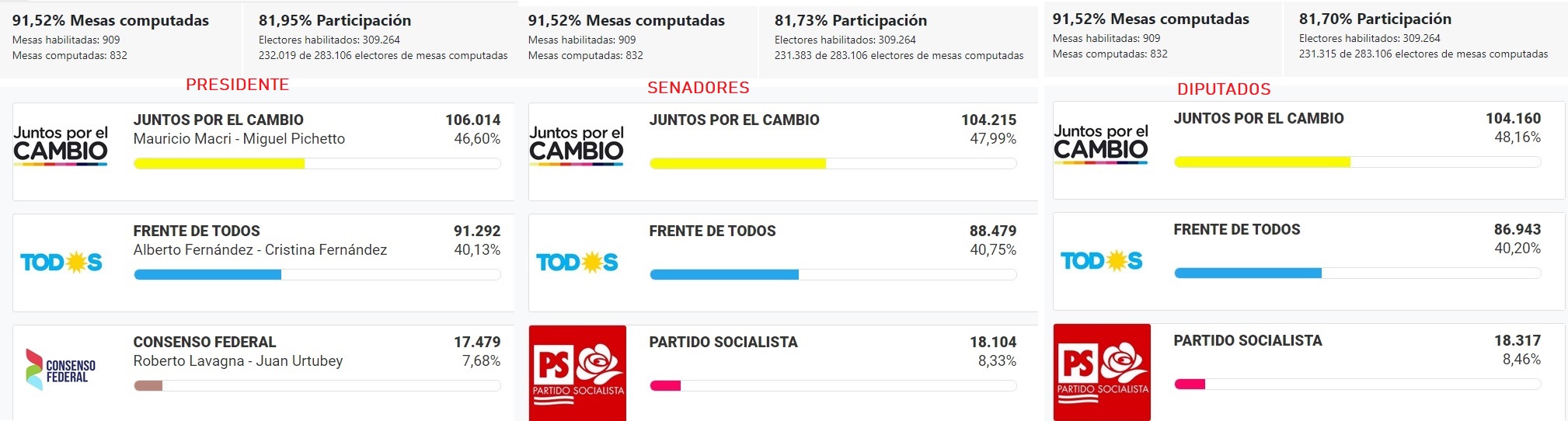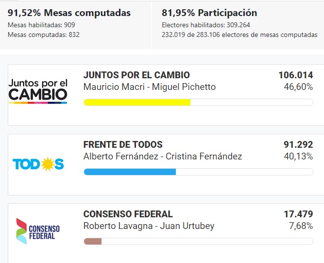 Los resultados oficiales publicados por la Cámara Nacional Electoral le dan el triunfo a Cambiemos con 46% a 40% con el 93% de las mesas escrutadas