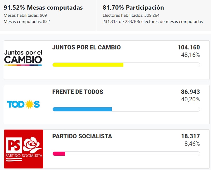 Para la senaduría, el oficialismo provincial sumó 88.479, mientras que Cambiemos tiene 104.215.