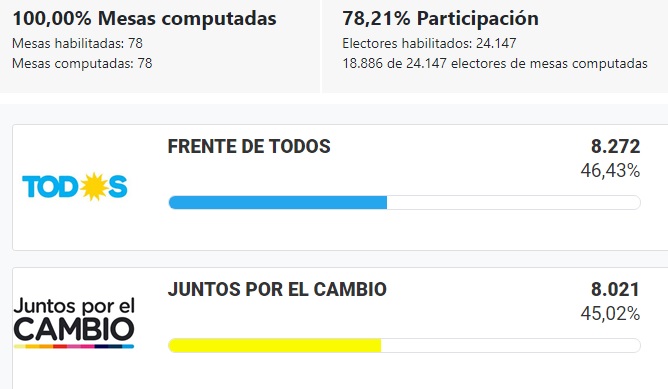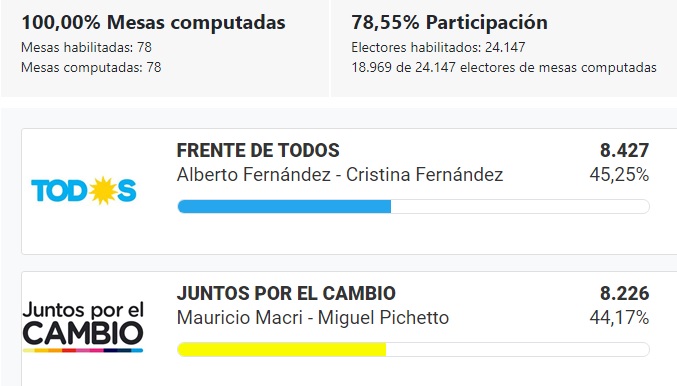 CompartirPara la diputación nacional, la diferencia a favor del oficialismo provincial no llega a los 100 votos con todas las mesas escrutadas. Resultados presidenciales: Senaduría Diputación: Compartir