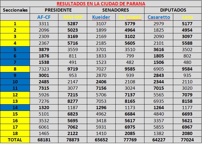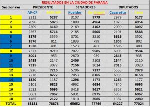 De las 18 seccionales, el PJ obtuvo la victoria solo en 7 seccionales paranaenses: la 5, 6, 7, 9. 10, 11 y 14.