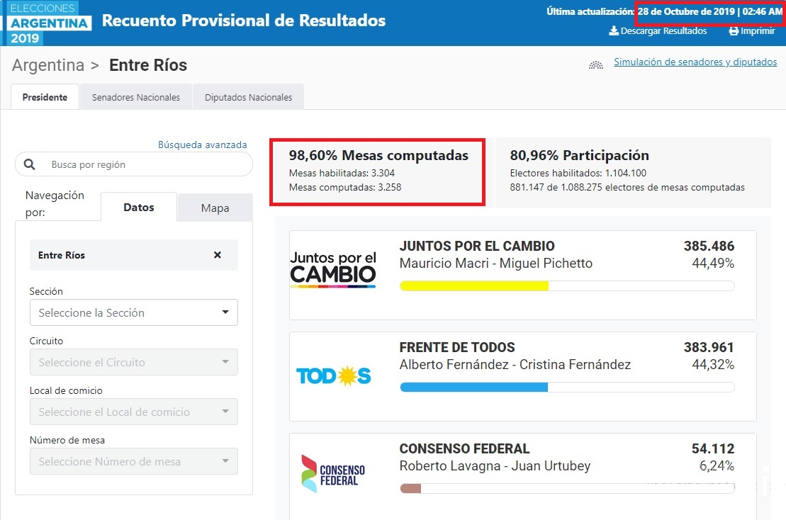 Los resultados oficiales de Entre Ríos no se actualizan desde las 2.46 de este lunes, cuando todavía faltaba publicar los recuentos provisorios de 46 mesas, distribuidas en 11 departamentos, entre los que se encuentran 10 mesas de Paraná, 8 de Concordia y 6 de Uruguay, entre otras.
