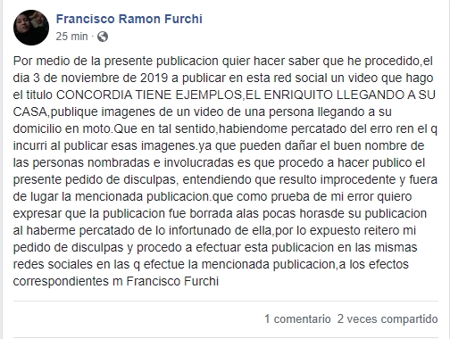“Por medio de la presente publicación quiero hacer saber que he procedido, el día 3 de noviembre de 2019 a publicar en esta red social un video que hago el título CONCORDIA TIENE EJEMPLOS, EL ENRIQUITO LLEGANDO A SU CASA, publiqué imágenes de un video de una persona llegando a su domicilio en moto. Que en tal sentido, habiéndome percatado del error en el que incurrí al publicar esas imágenes, ya que pueden dañar el buen nombre de las personas nombradas e involucradas, es que procedo a hacer público el presente pedido de disculpas, entendiendo que resultó improcedente y fuera de lugar la mencionada publicación”, posteó el mismo titular del mencionado perfil.