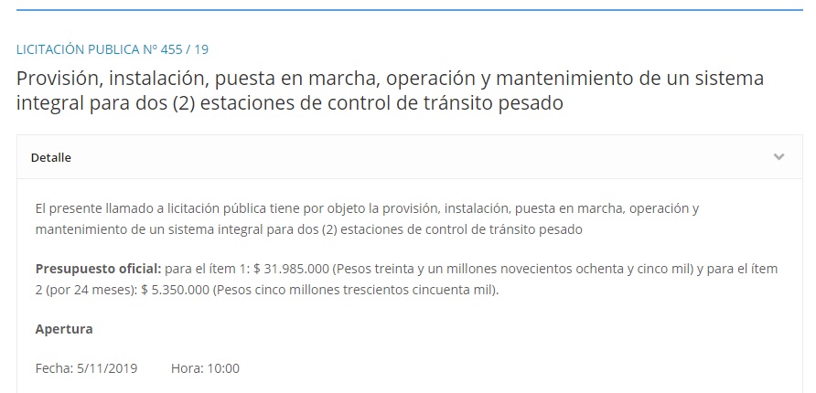 La LICITACIÓN PUBLICA Nº 455 / 19 de 5/11/2019 mediante la cual se contrata la Provisión, instalación, puesta en marcha, operación y mantenimiento de un sistema integral para dos (2) estaciones de control de tránsito pesado.