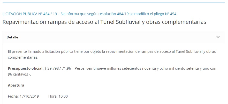 Mediante la LICITACIÓN PUBLICA Nº 454/19 el Túnel prevé desembolsar la suma de $29.798.171,96 (veintinueve millones setecientos noventa y ocho mil ciento setenta y uno con 96 centavos) para la repavimentación rampas de acceso al Túnel Subfluvial y obras complementarias.
