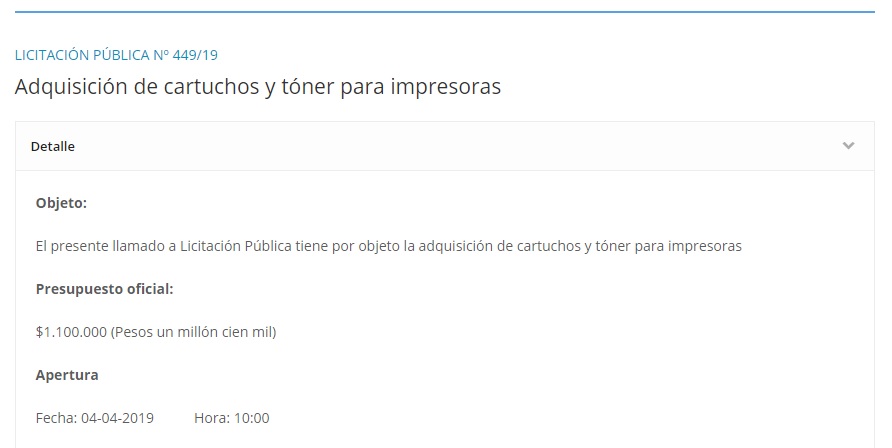 Uno de los gastos más llamativos por su exorbitancia que aparecen lo constituye la LICITACIÓN PÚBLICA Nº 449/1 adquiere, cartuchos y tóner para impresoras, previéndose la erogación de $1.100.000 (Pesos un millón cien mil).