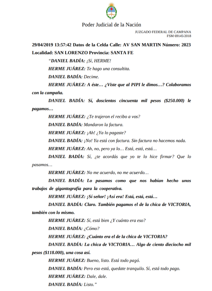 DANIEL BADÍA: Lo pasamos como que nos habían hecho unos trabajos de gigantografía para la cooperativa”. HERME JUÁREZ: ¡Sí señor! ¡Así era! Está, está, está…DANIEL BADÍA: Claro. También pagamos el de la chica de VICTORIA, también con lo mismo. HERME JUÁREZ: Sí, está bien ¿Y cuánto era eso?. DANIEL BADÍA: ¿Cómo?. HERME JUÁREZ: ¿Cuánto era el de la chica de VICTORIA?. DANIEL BADÍA: La chica de VICTORIA… Algo de ciento dieciocho mil pesos ($118.000), una cosa así. HERME JUÁREZ: Bueno, listo. Está todo pago. DANIEL BADÍA: Pero eso está, quedate tranquilo. Sí, está todo pago. HERME JUÁREZ: Dale, dale. DANIEL BADÍA: Listo.”