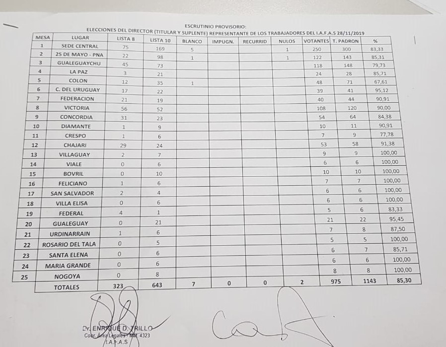Los números de los comicios en IAFAS: UPCN 643. ATE 323. Participaron 975 trabajadores afiliados, el 85,30%
