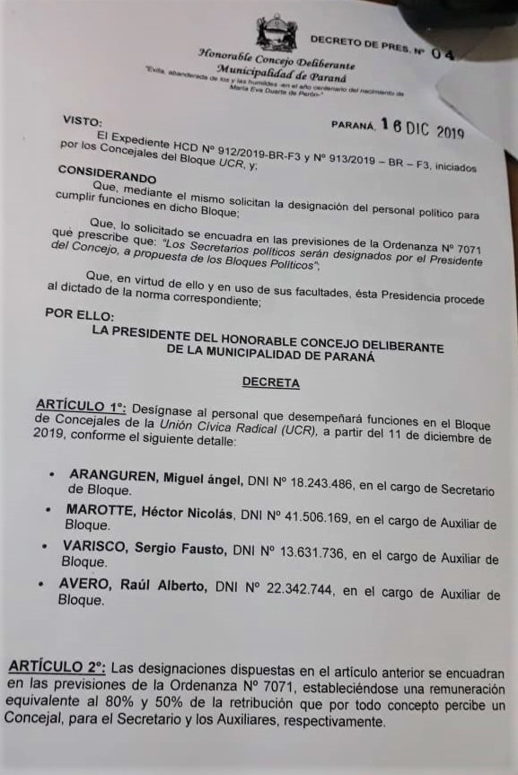 Más allá de eso, el decreto que confirma el complot entre Avero, Rolandelli y Aranguren, en perjuicio de González, también designa a Varisco como auxiliar del bloque.