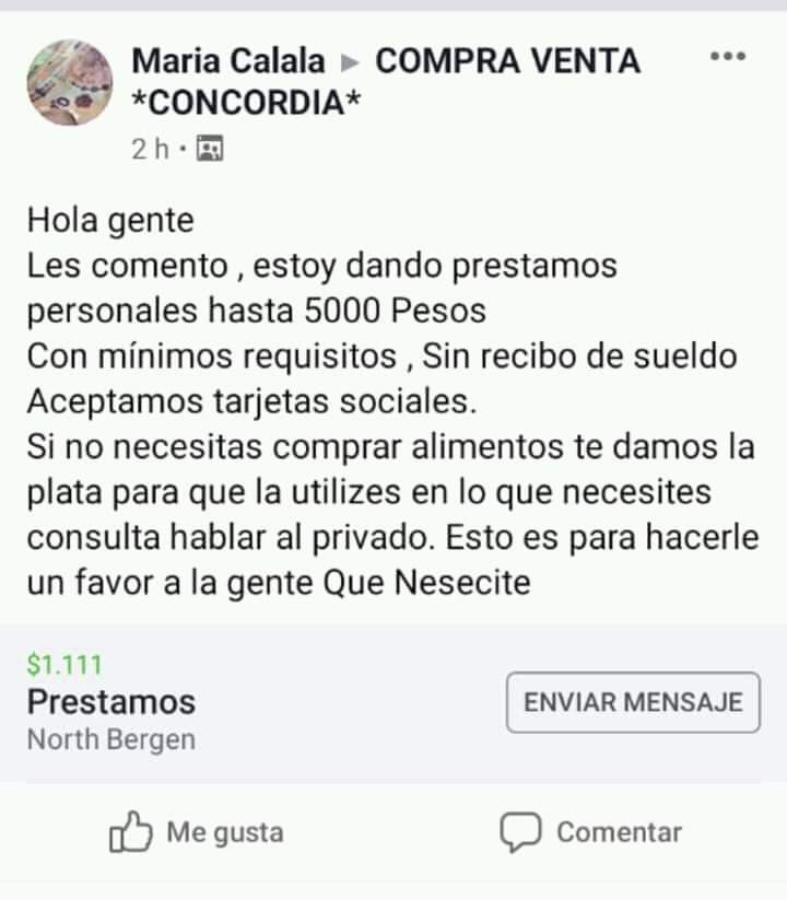 Este jueves por la tarde llegaron a la redacción de este Portal distintas capturas de grupos de compraventa de Facebook de la capital del citrus ofreciendo créditos con mínimos intereses aceptando, como contraprestación, las tarjetas sociales.