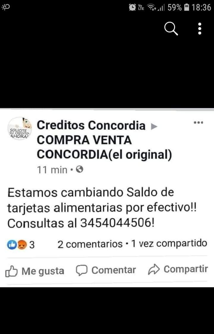 En otra publicación del usuario “Créditos Concordia”, se puede apreciar mejor cual en que consiste el ofrecimiento, se cambia el saldo de la tarjeta por dinero”, dejándose un teléfono de contacto.