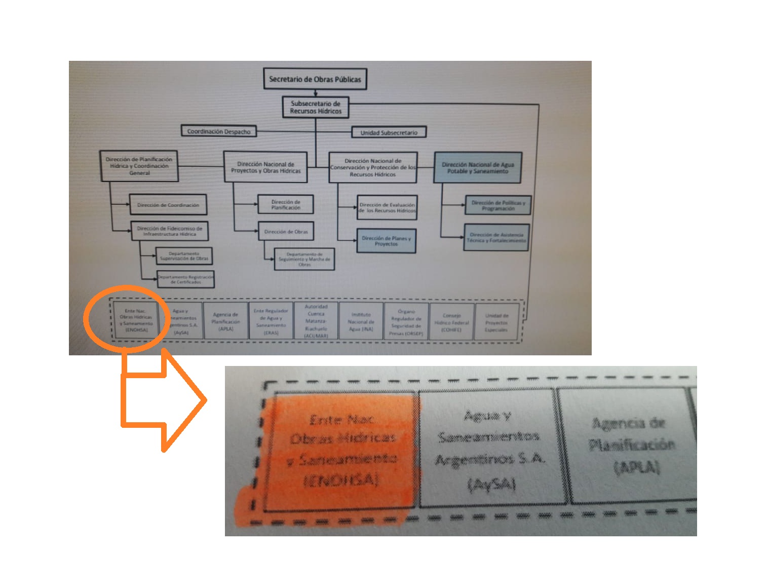 Como se puede apreciar en la estructura de la secretaria de obras públicas, cuyo titular es el Martin Gill, el intendente de Villa María Córdoba, en ENOHSA esta allá abajo junto a otros entes como AySA, APLA, entre otros, todos los cuales dependen de la Subsecretaria de Recursos Hídricos.