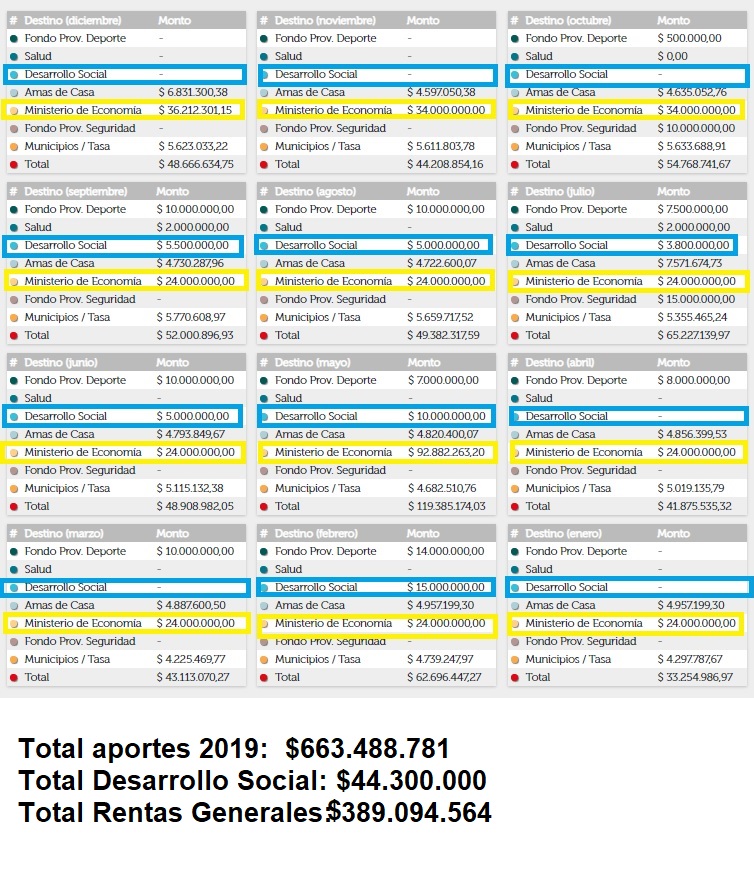Según los datos del IAFAS, solo durante el 2019, rentas recibió la considerable cifra de 389 millones de pesos, mientras, insistimos, desarrollo social, los más humildes, 44 millones.