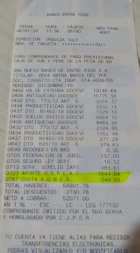 Una de las jubiladas afectadas, no tuvo reparos en hacer público su último recibo de sueldo con los descuentos, 1.644 pesos de su haber se van en la obra social.