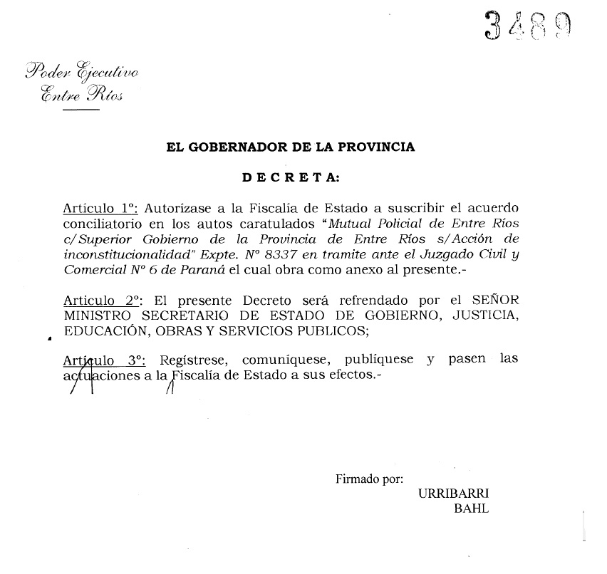El litigio duro varios años, hasta que a fines del 2009, el entonces gobernador Sergio Urribarri suscribía el Decreto 3.489/2019 autorizando a la Fiscalía de Estado “a suscribir el acuerdo conciliatorio” en el marco de la causa judicial caratulada “Mutual Policial de Entre Ríos c/Superior Gobierno de la Provincia de Entre Ríos s/Acción de inconstitucionalidad”, Expediente Nº 8.337 en trámite ante el Juzgado Civil y Comercial Nº 6 de Paraná a cargo del Dr. Federico Planas.