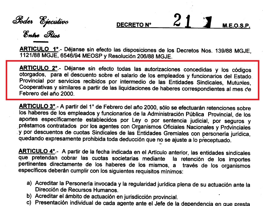 En enero del 2000 –hace 20 años- a través del Decreto Nº21 se dejaron sin efecto todas las autorizaciones concedidas y códigos otorgados para descuentos sobre el salario de los empleados y funcionarios del Estado Provincial y servicios recibidos por intermedio de entidades sindicales, mutuales, cooperativas y similares.