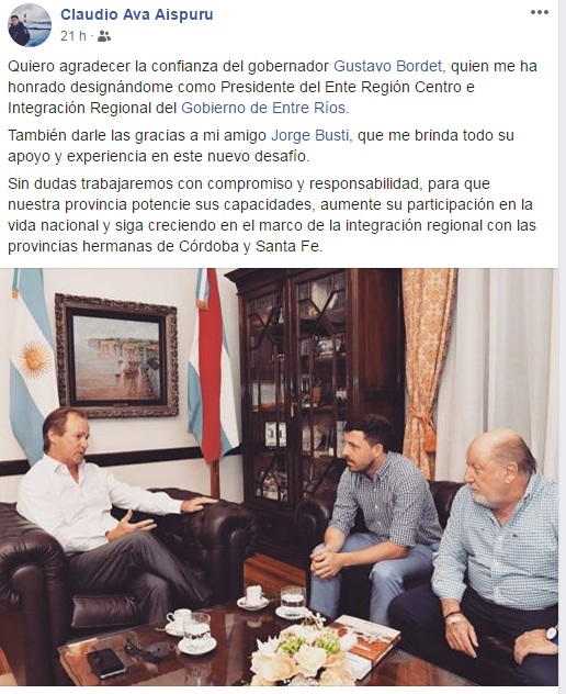 La noticia la dio a conocer el propio Ava Aispuru en las redes sociales, informando que Bordet, lógicamente a instancias de Busti -a quien, por cierto, agradeció- lo había designado al frente del Ente.