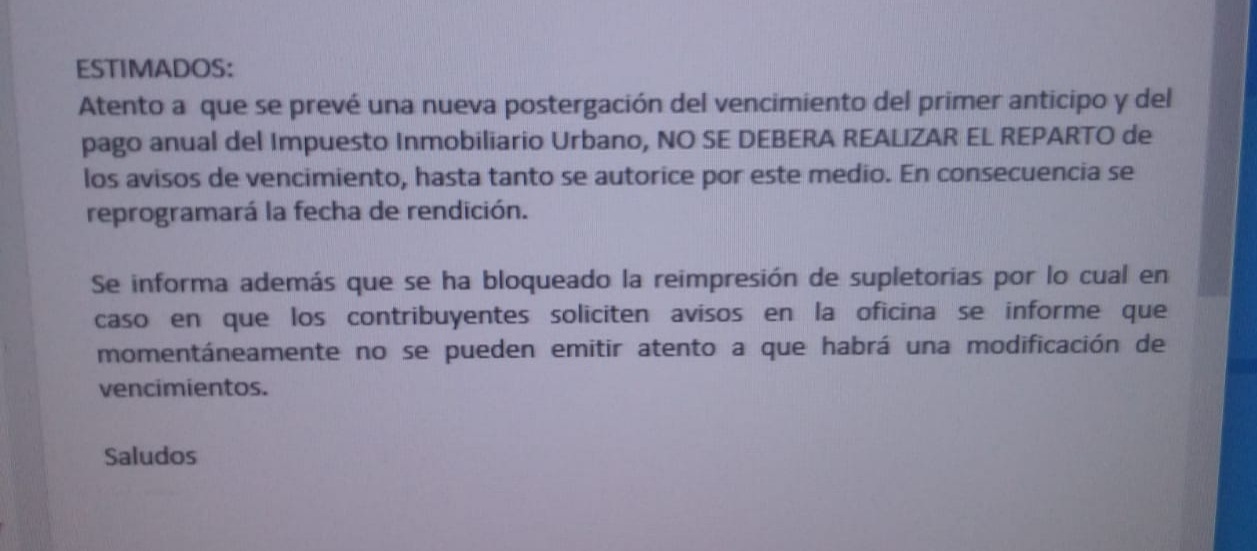 “ESTIMADOS: Atento a que se prevé una nueva postergación del vencimiento del primer anticipo y del pago anual del impuesto inmobiliario urbano, NO SE DEBERA REALIZAR EL REPARTO de los avisos de vencimiento, hasta tanto se autorice por este medio. En consecuencia se reprogramara la fecha de rendición”.
