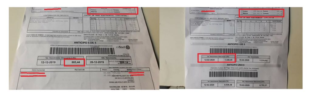 Boletas del primer vencimiento del inmobiliario 2020 enviadas a la redacción de este medio por contribuyentes indignados contradicen el anuncio del oficialismo provincial, existen incrementos de 72%.