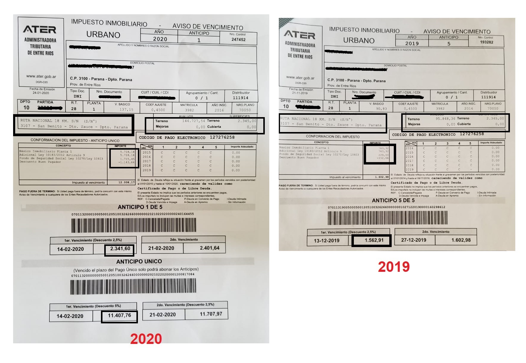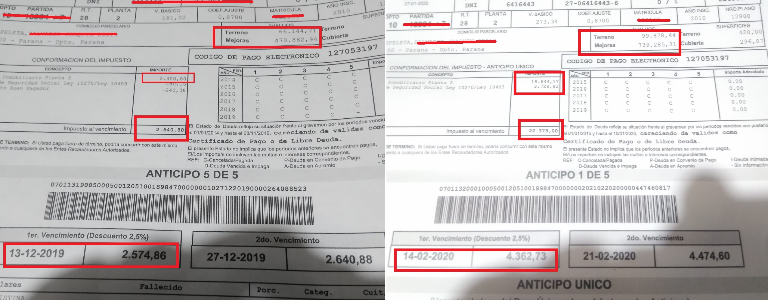 Paraná, parece ser la más castigada por el impuestazo del Gobierno. Un vecino de calle Ezpeleta de la capital indignado envió las boletas a este Portal, al mismo le llegó un aumento en las mejoras del 70%, a pesar de que Grané dijo que no superaría el 50, de bolsillos representa un 72% más a pagar en el primer anticipo del primer vencimiento 2020 respecto del ultimo anticipo del primer vencimiento del 2019.