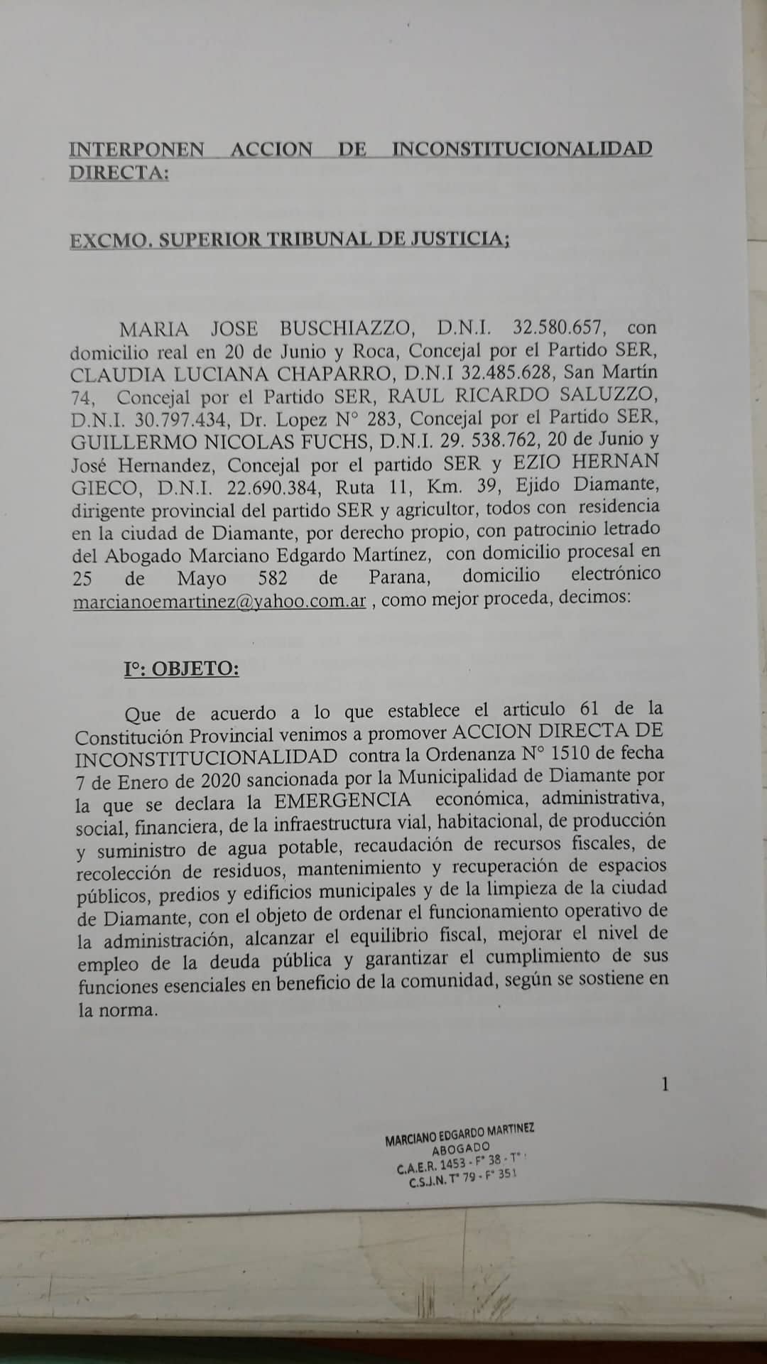 En la ciudad de Diamante, concejales de la oposición al intendente Juan Carlos Darrichón acudieron al Superior Tribunal de Justicia (STJ) para que se expida sobre la inconstitucionalidad de la ordenanza de emergencia (Nº1510) que votó el oficialismo.