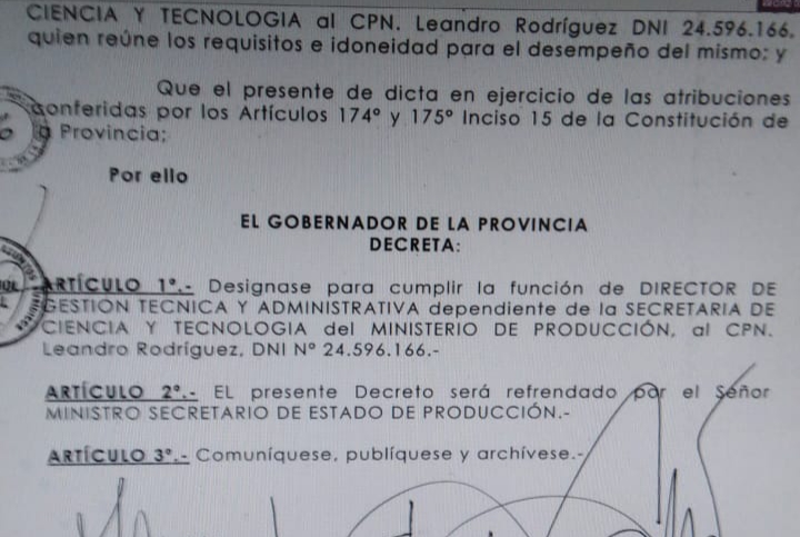 Se trata del contador público Leandro Rodríguez que, conforme el decreto del gobernador, fue nombrado como director de gestión técnica y administrativa de la secretaria de ciencia y tecnología de la cartera del ex diputado nacional.