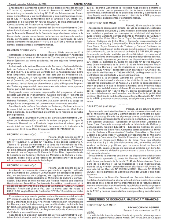 Y por último, el 3265, campaña correspondiente al Ministerio de Cultura y Comunicación: “Educando en Movimiento: Una Política Pública que Modifica Realidades en Entre Ríos/ Gobierno de Entre Ríos”.