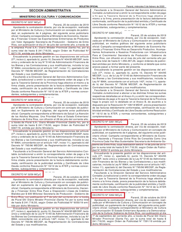 Así, los Decretos 3257, 3258, 3259, 3261, 3262 y 3265 en donde aparece como beneficiaria la firma Plural S.A. por el medio Diario Mirador provincial, adjudicándole en cada uno el mismo monto de dinero, $241.718,50.