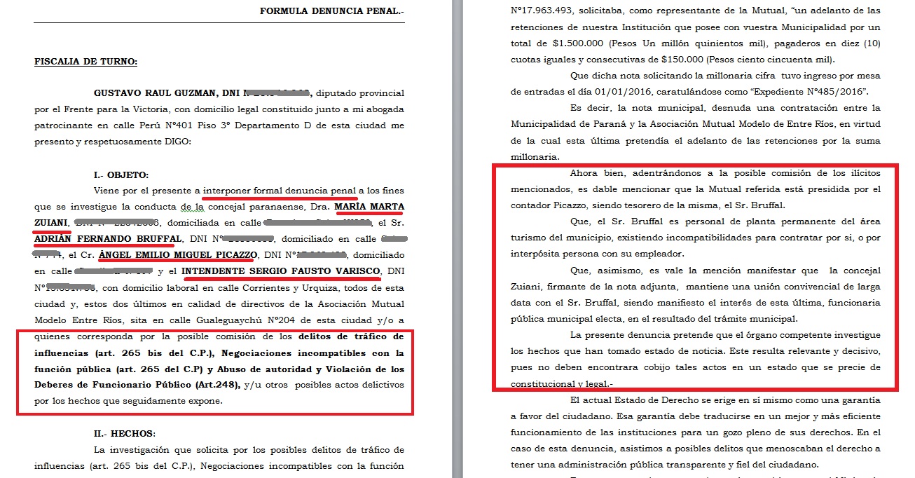 La misma misiva que había llegado a manos del entonces diputado provincial Gustavo Guzmán, sumada a las irregularidades que surgían de la misma, cimentaron la denuncia formal.