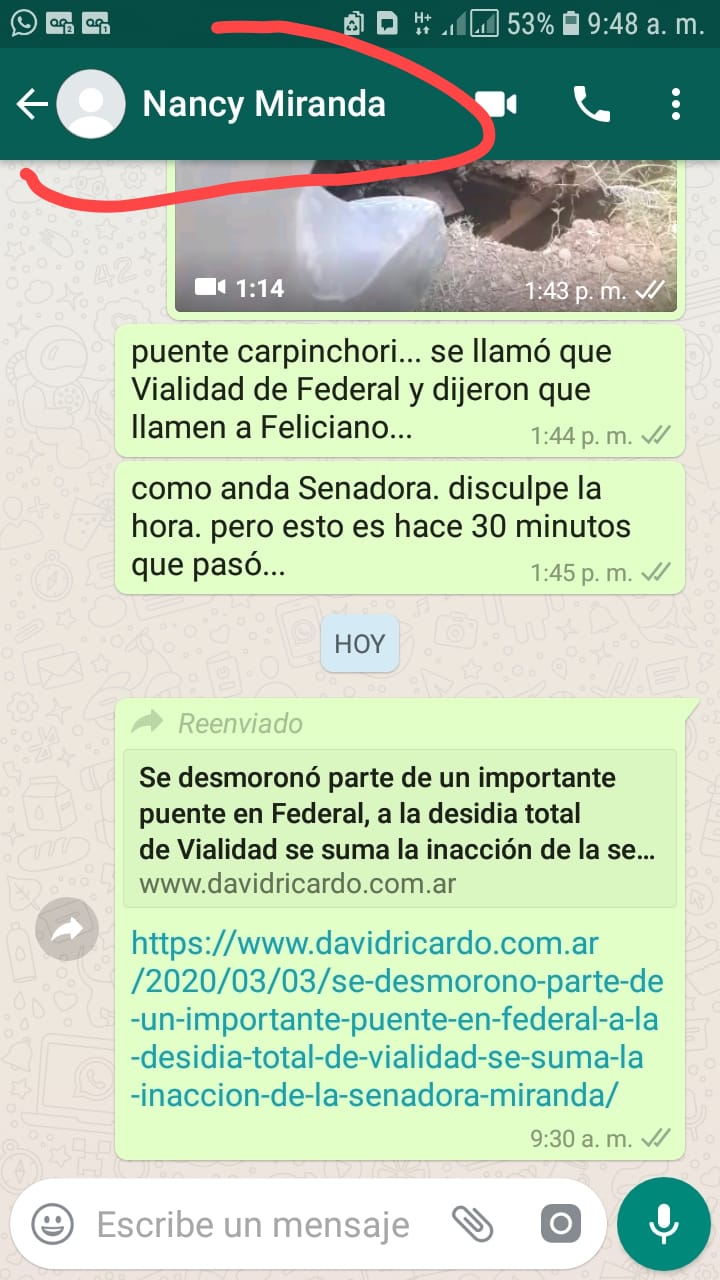El federalense le envió por whatsapp la noticia del Portal, de inmediato la senadora, sin pronunciar palabra, lo bloqueó en dicha red social.