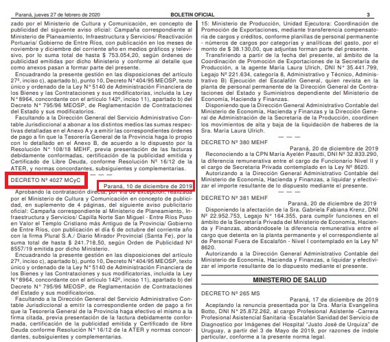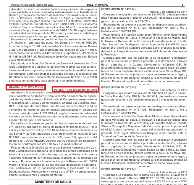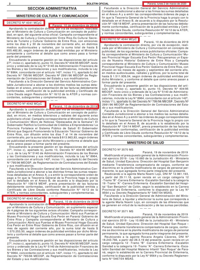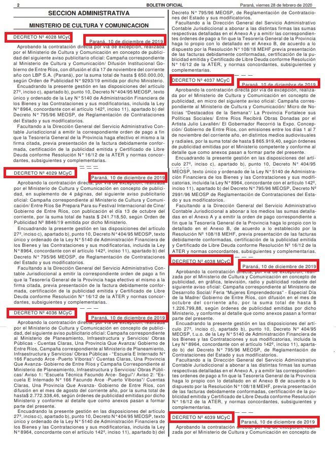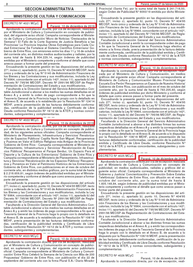 De los boletines Nro. 26.839 – 038/20, 26.840 – 039/20, y Nro. 26.841 – 040/20, del 27/02/2020, 28/02/2020 y 03/03/2020, respectivamente, surgen el numero de 18 decretos firmados por Bordet y refrendados por Kueider, conteniendo, lógicamente, 18 contrataciones directas y por vía de excepción que suman $17.513.573,93, en letras, diecisiete millones quinientos trece mil quinientos setenta y tres con noventa y tres centavos.