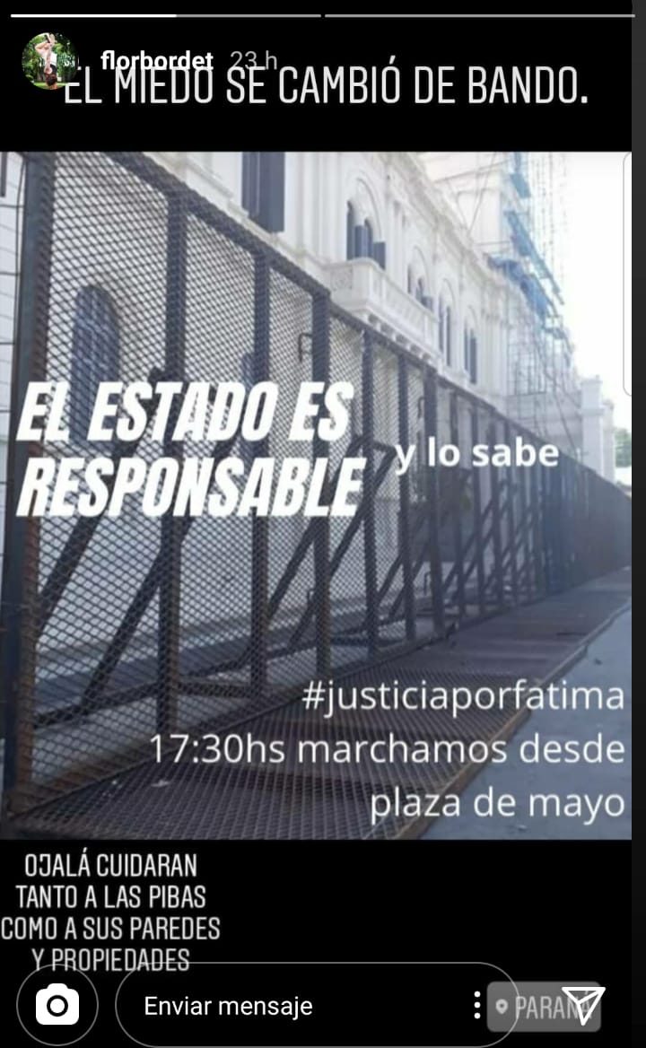 “El miedo se cambió de bando”, posteó la joven en flyer que circuló por las redes sociales convocándose a la posterior masiva concentración, agregando “ojala cuidaran tanto a las pibas como a sus paredes y propiedades”, un claro mensaje para su padre.