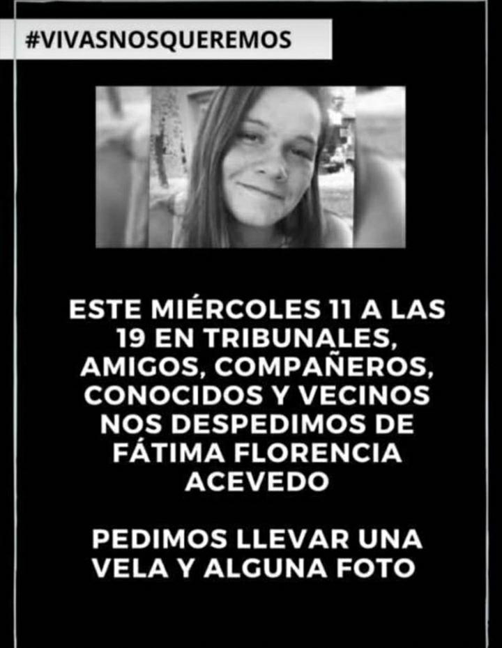 Convocan a amigos, familiares, conocidos y vecinos en general para este miércoles a las 19 horas en las puertas del palacio de Justicia para despedir a la joven asesinada que padeció la desidia del Estado.